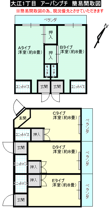 | 間取り | 1K(ユニットバス)洋室約8畳〜 ※部屋タイプにより若干異なりますので内覧の際にご確認ください。 |